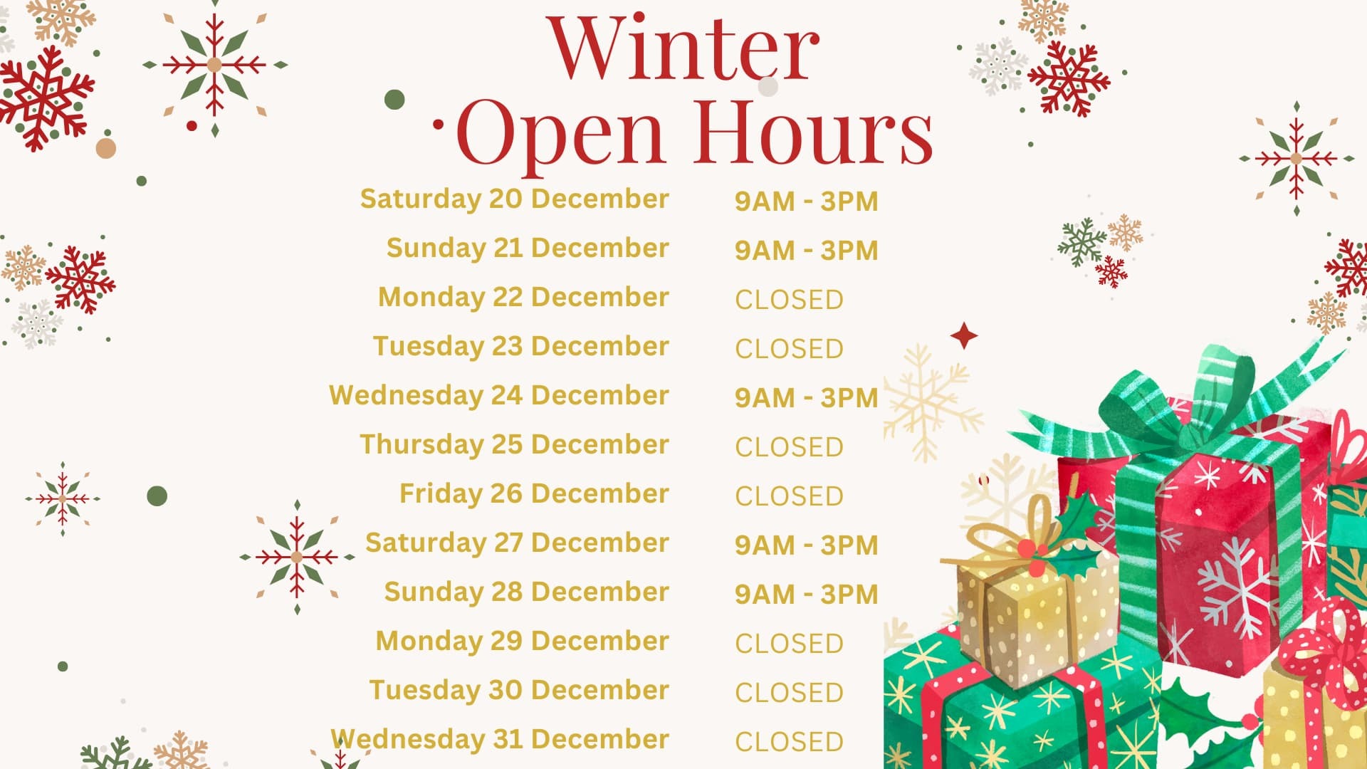 Forgot to place an order? No worries. We're open for in-store shopping on Christmas Eve from 9:00 am to 3:00 pm.